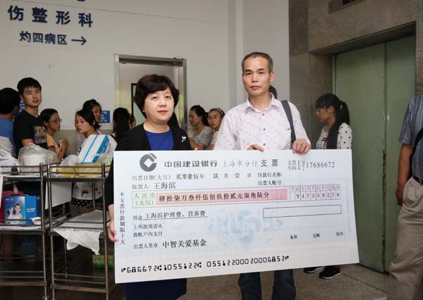 2015年9月1日,瑞金医院灼伤科病房外,一张47万元的支票由中智集团副总经理王慧递交给了火海英雄、“中智好雇员”王海滨的父亲,这其中包含着无数的牵挂和关爱,“我们是代表所有募捐者来传达我们的关心,希望海滨能尽早康复,也希望你们能保重身体。”